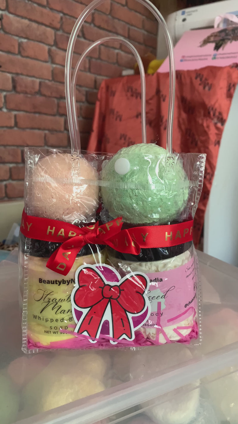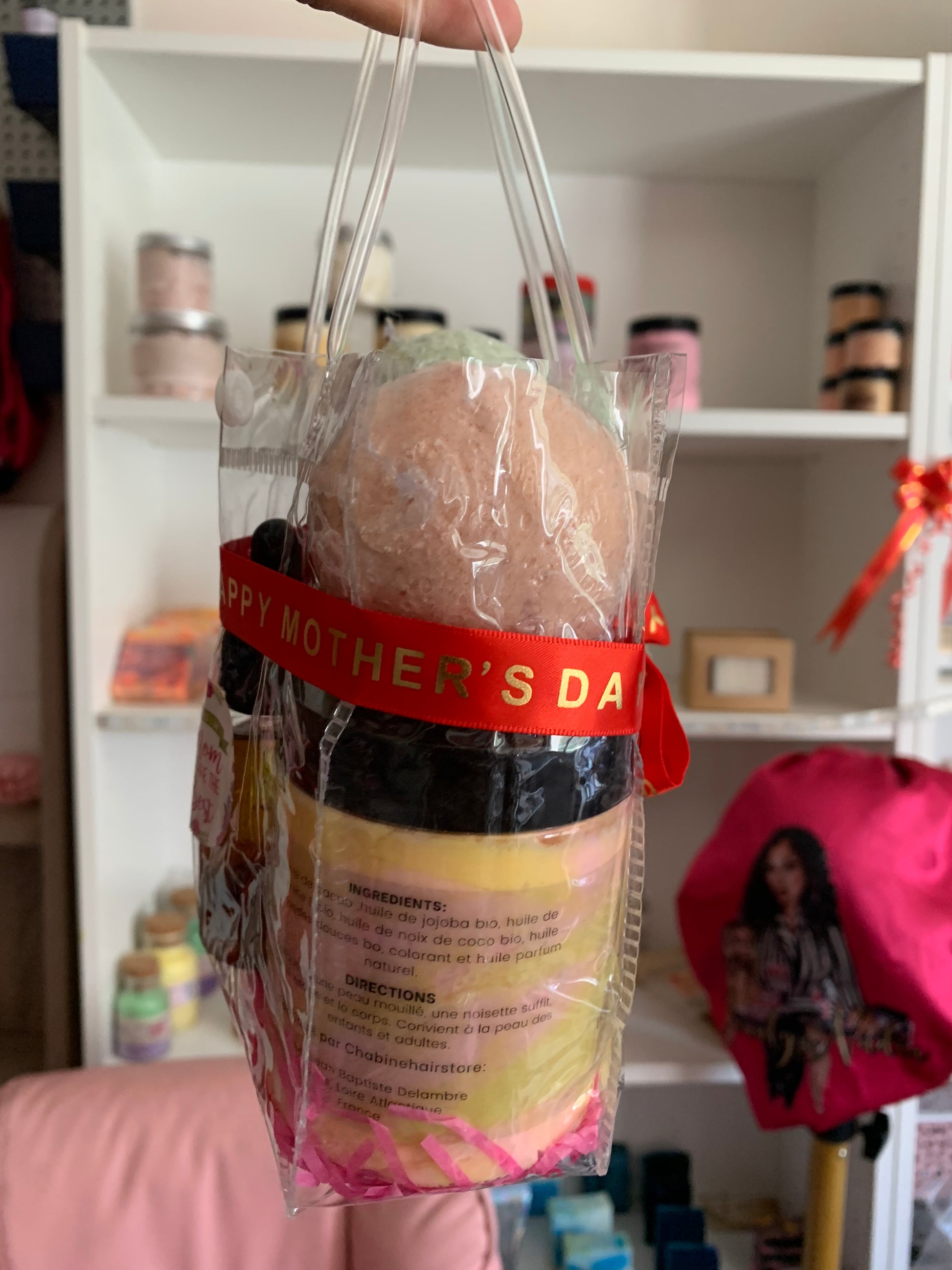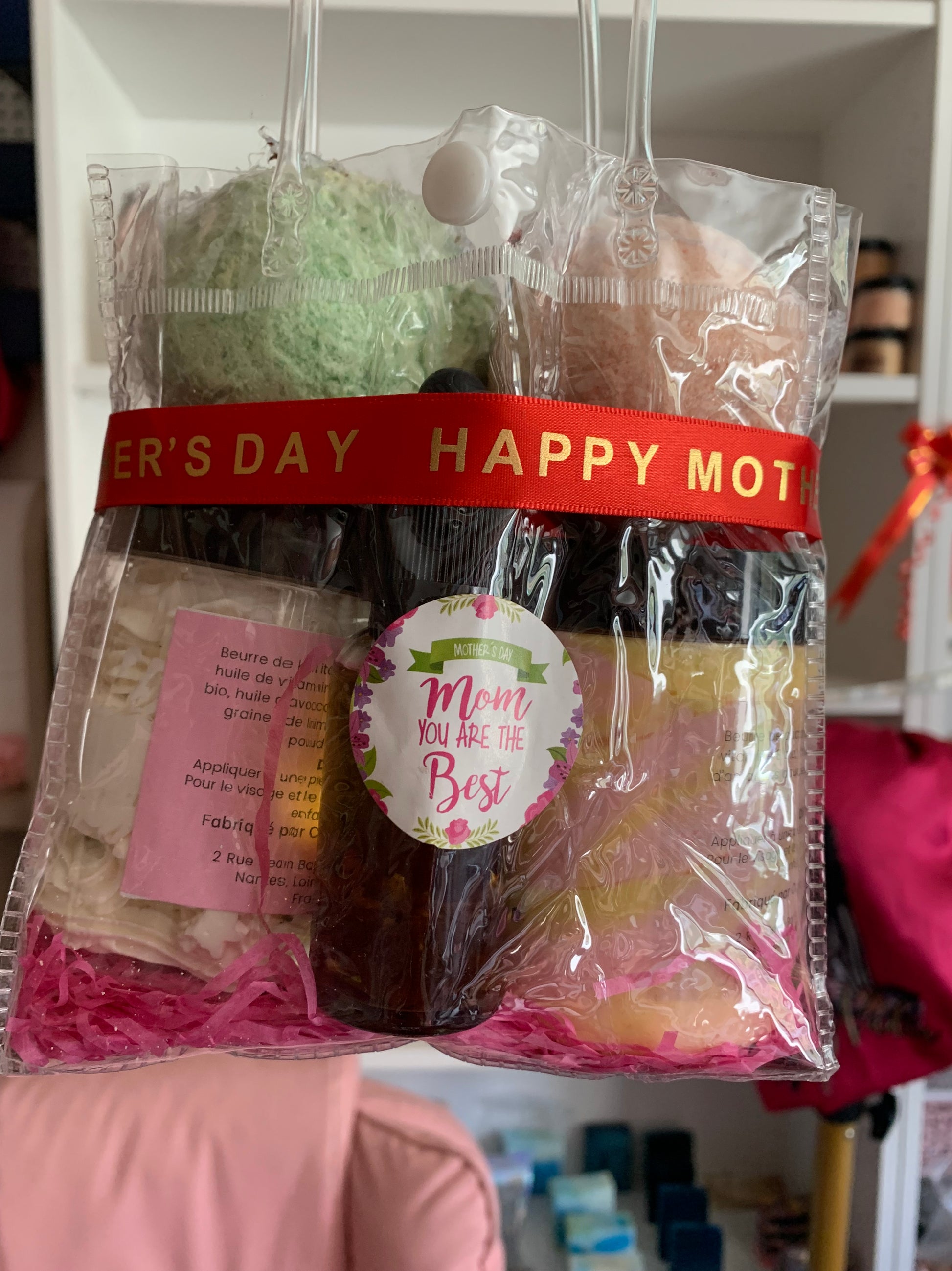 Un jolie petit sac (bonne idée cadeau) bien décoré qui contient des produits de bain: