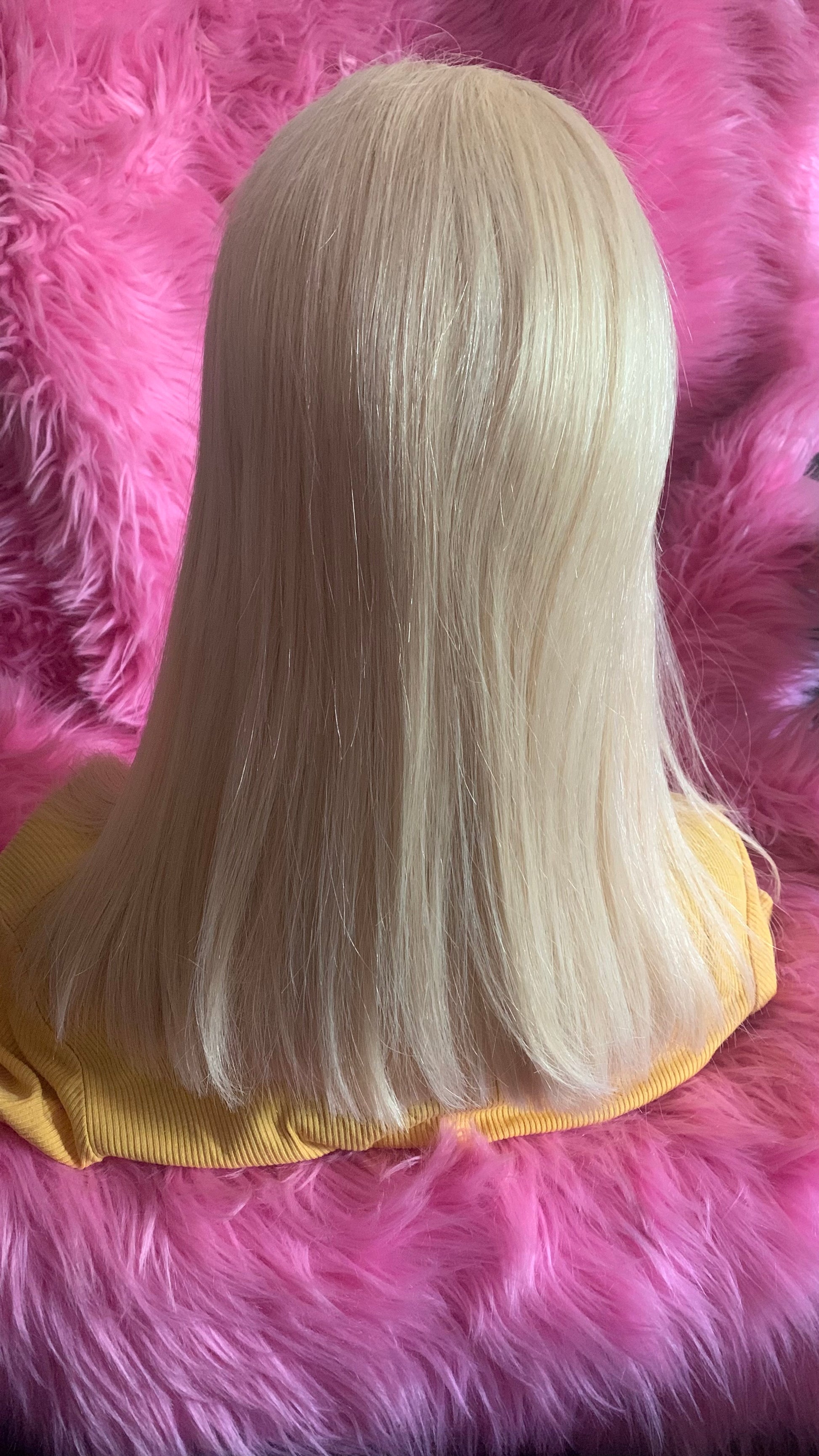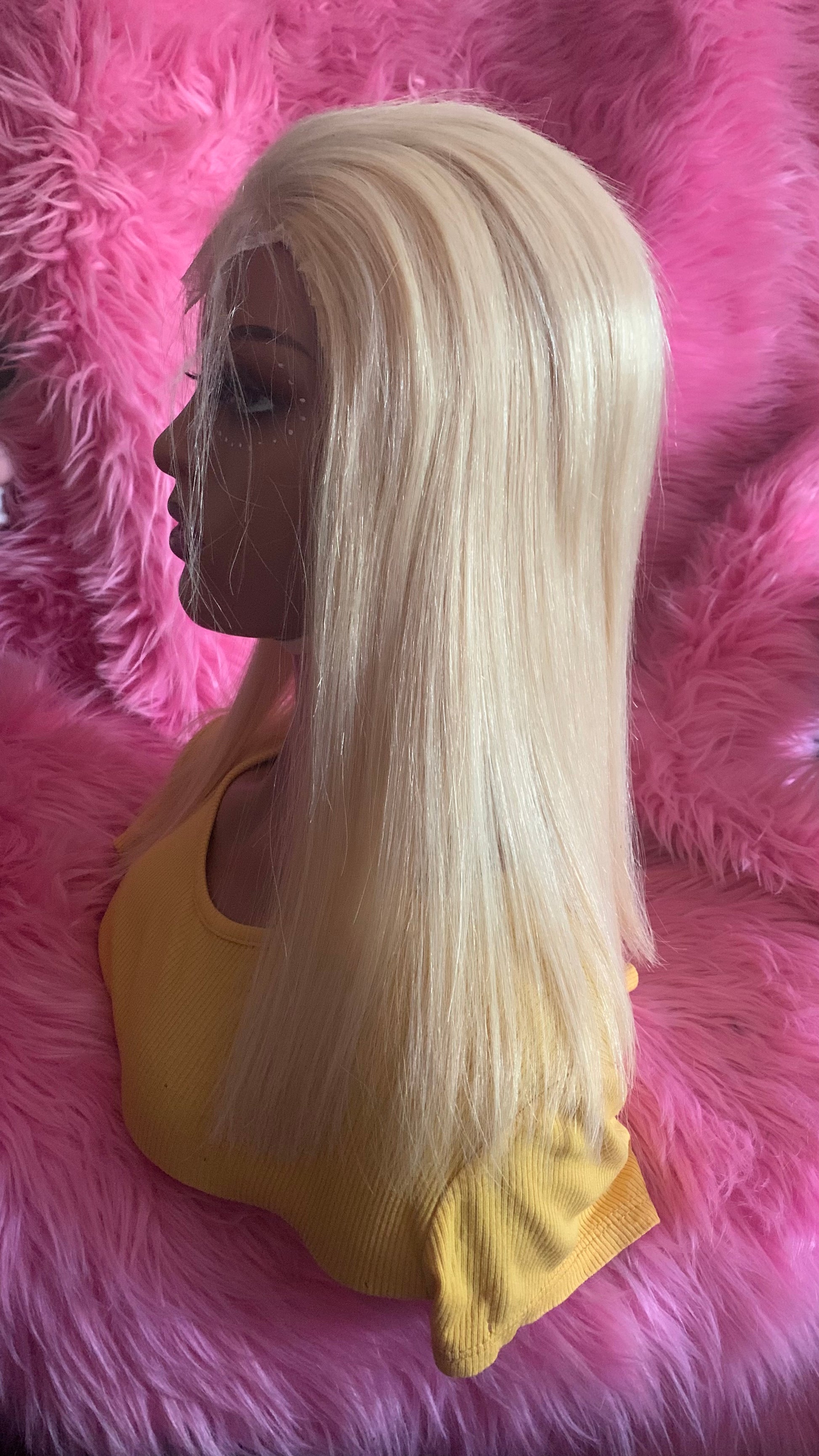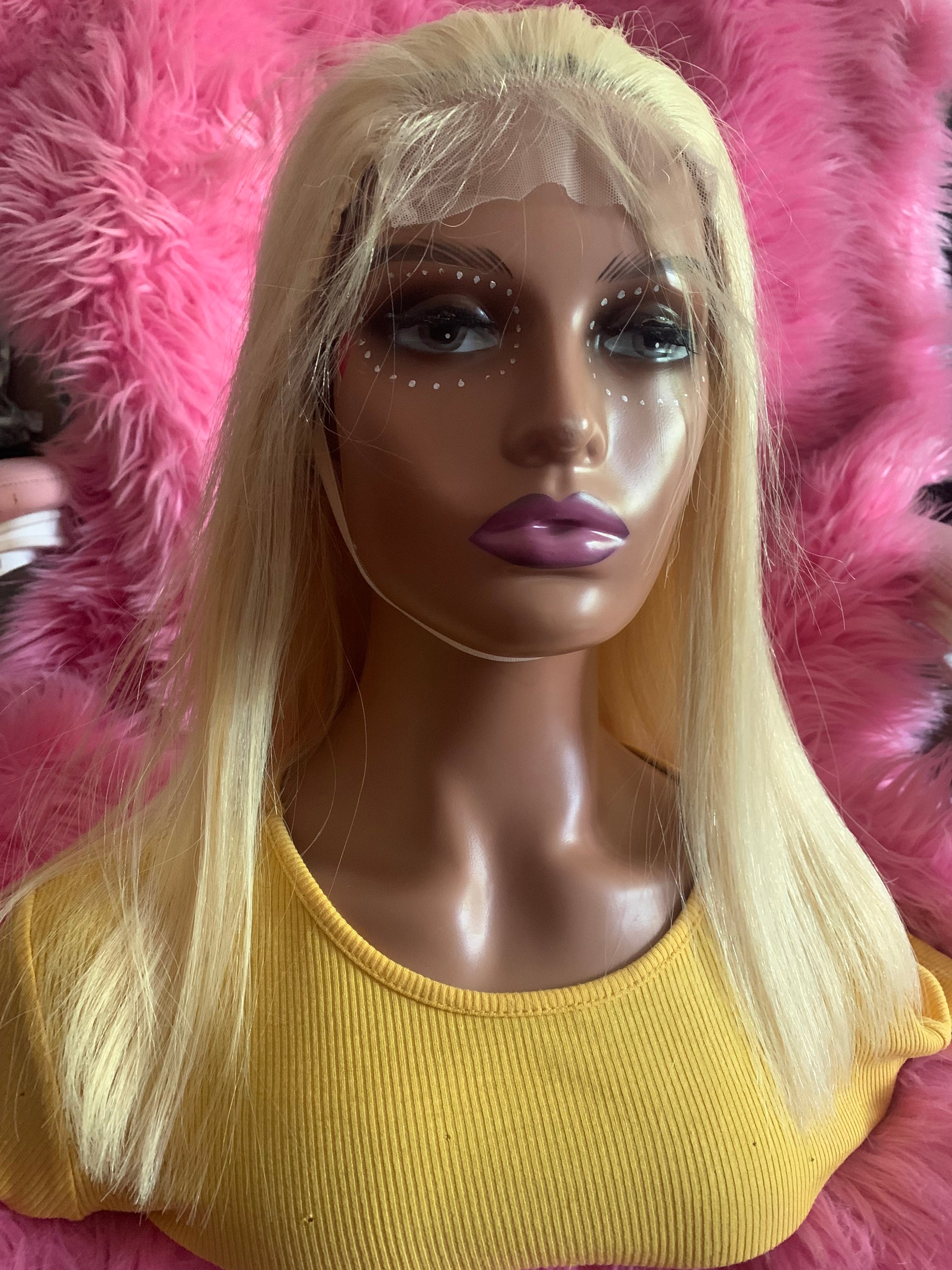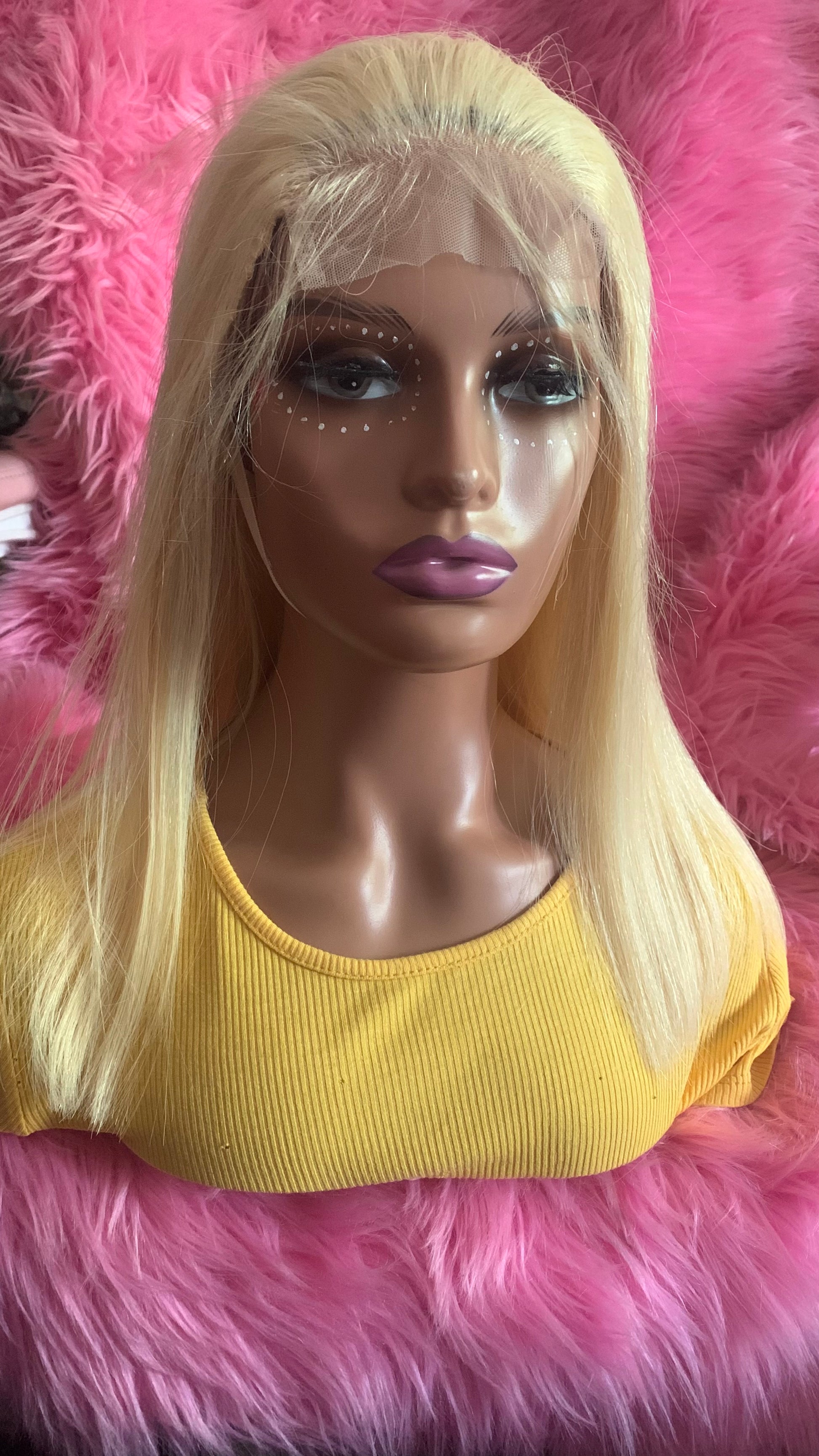Perruque brésilien, blonde, lisse, 14pouces, avec closure 2×6, densité 150%,avec bande élastique pour securiser la perruque sur la tête.
