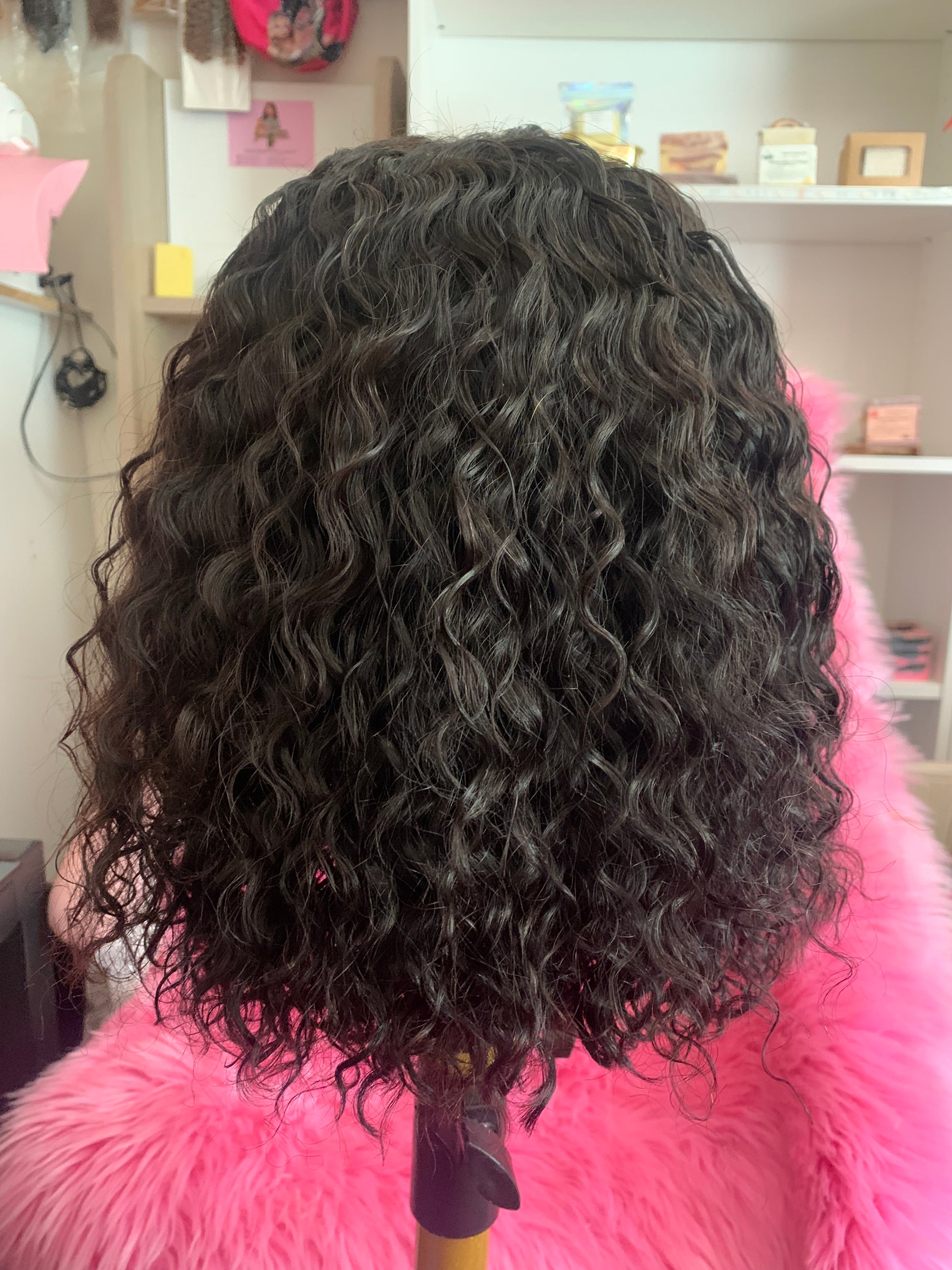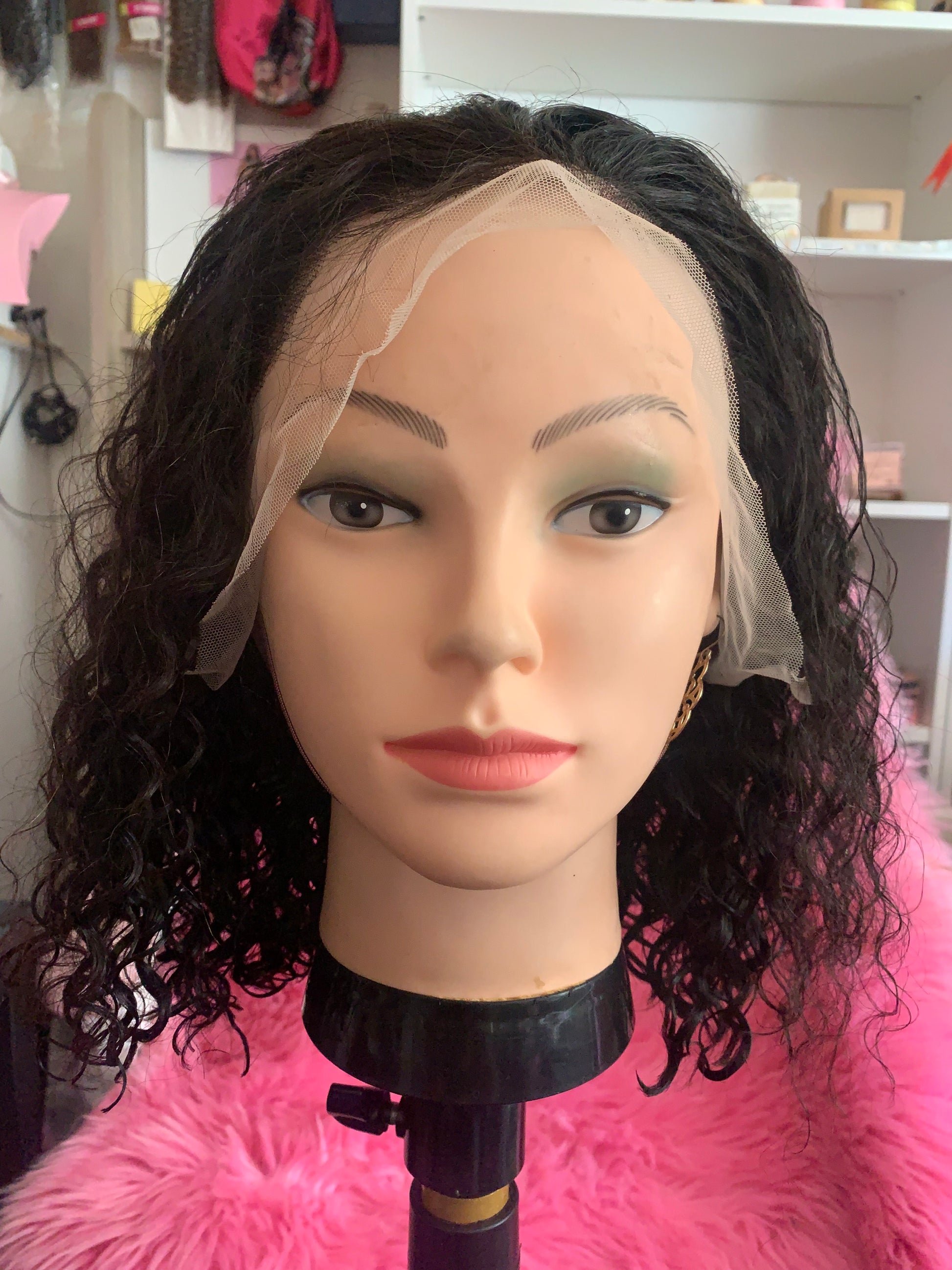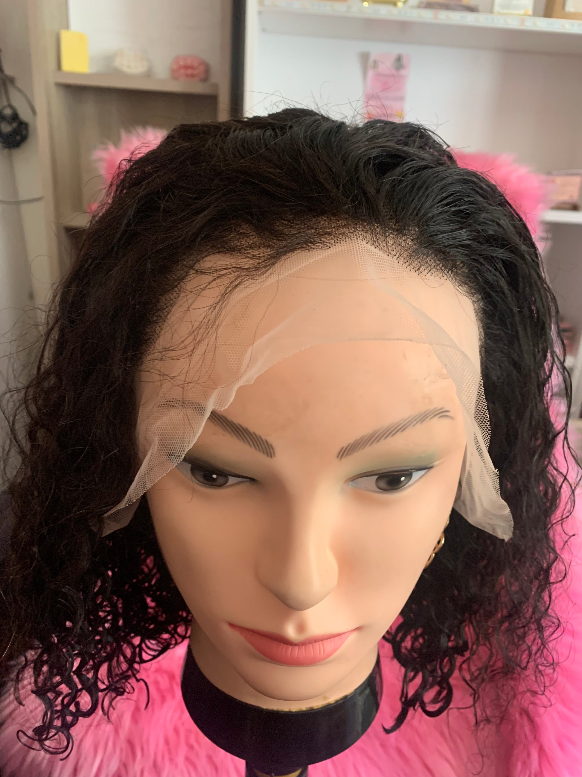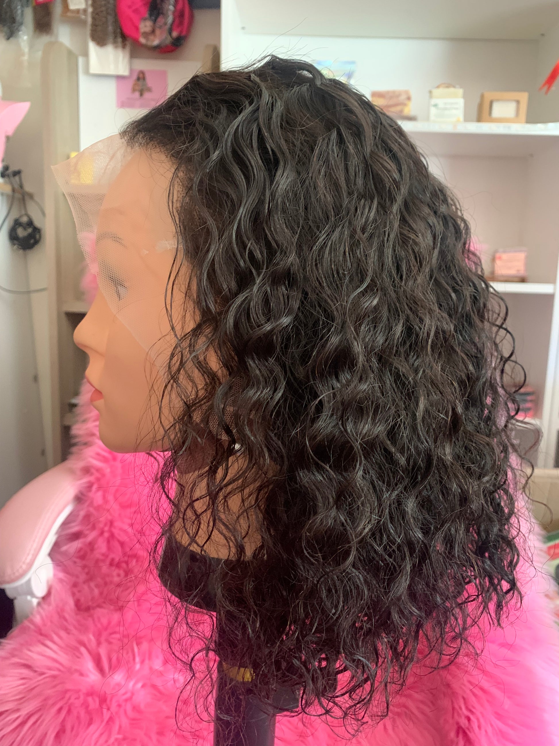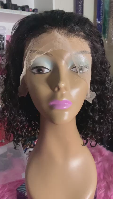 Perruque brésilien, bouclé, 12pouces, avec lace frontal, couleur naturel avec bande élastique pour securiser la perruque sur la tête, densité 150%.