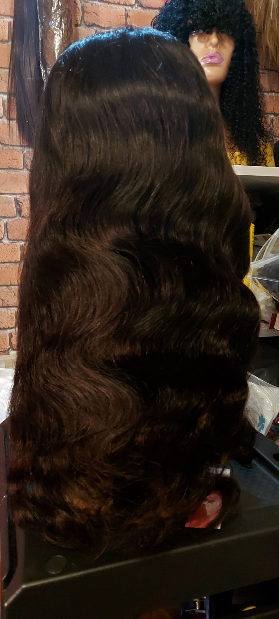 Brésilien, 22pouces, ondulée, couleur naturel, densité 180%, avec bande élastique pour securiser la perruque sur la tête.