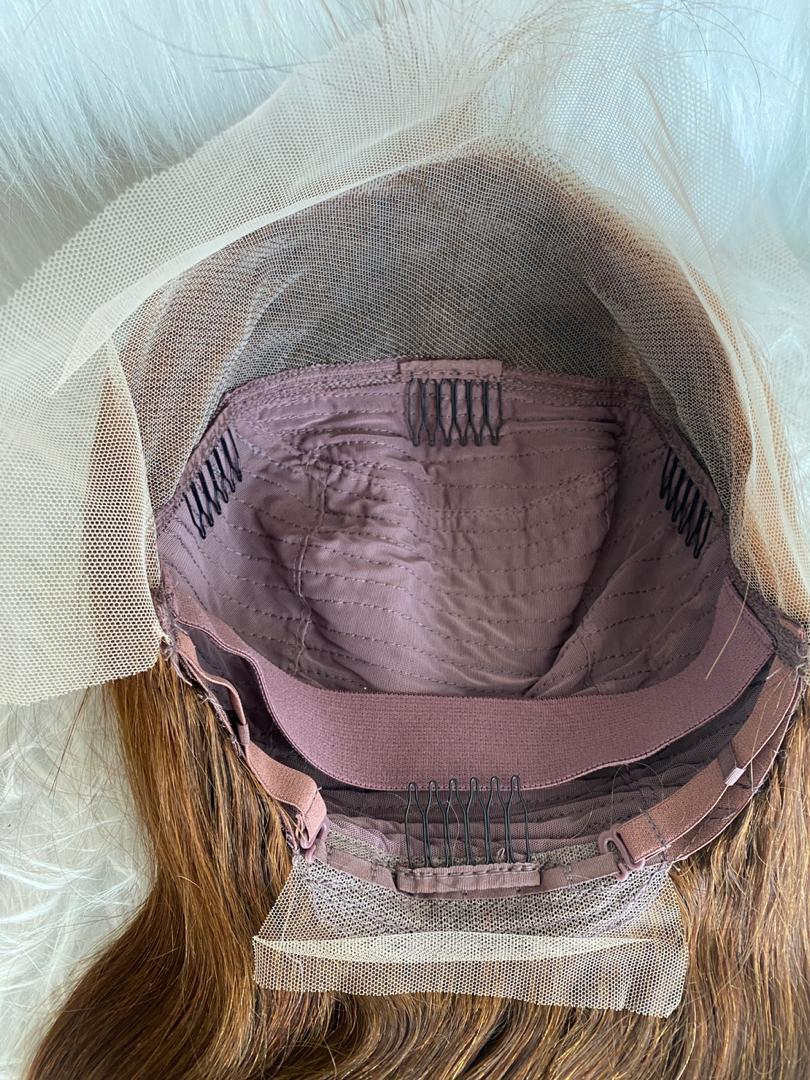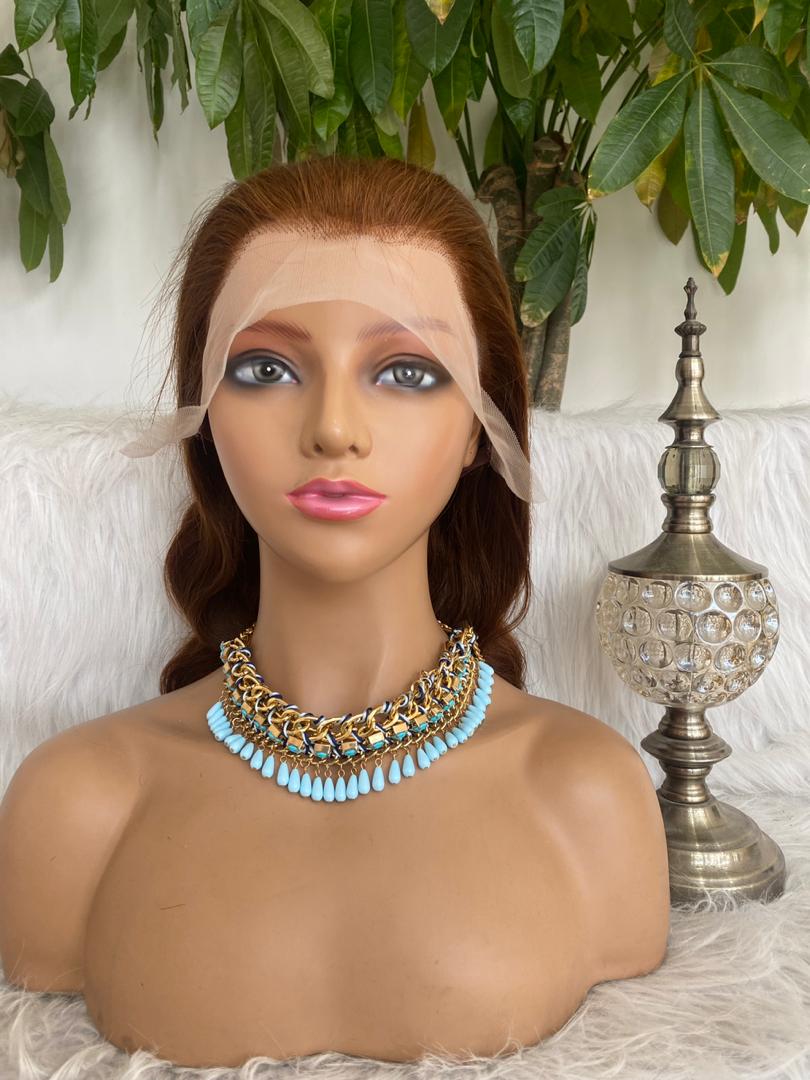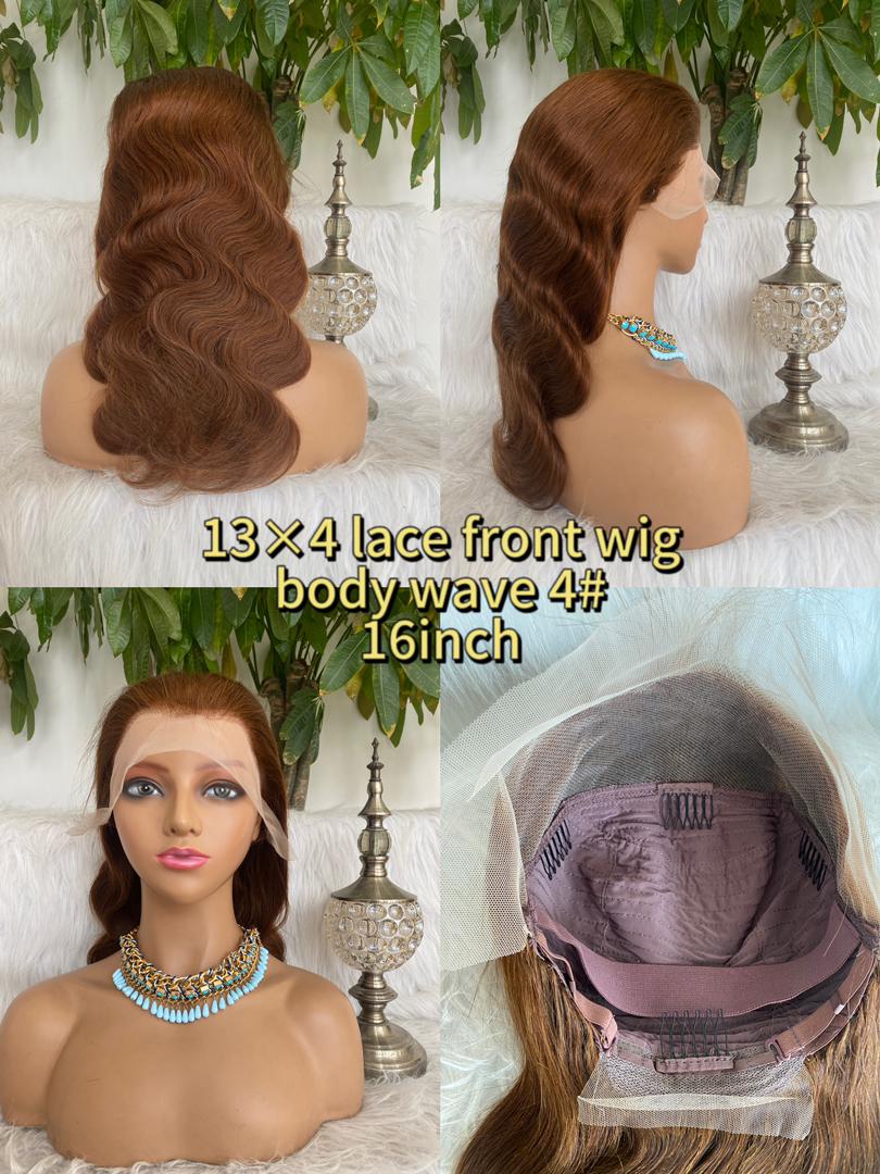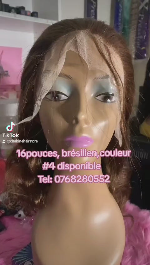 Perruque brésilien, 16pouces, ondulé, couleur #4, densité 150%, avec lace frontal at bande élastique pour securiser la perruque sur la tête.